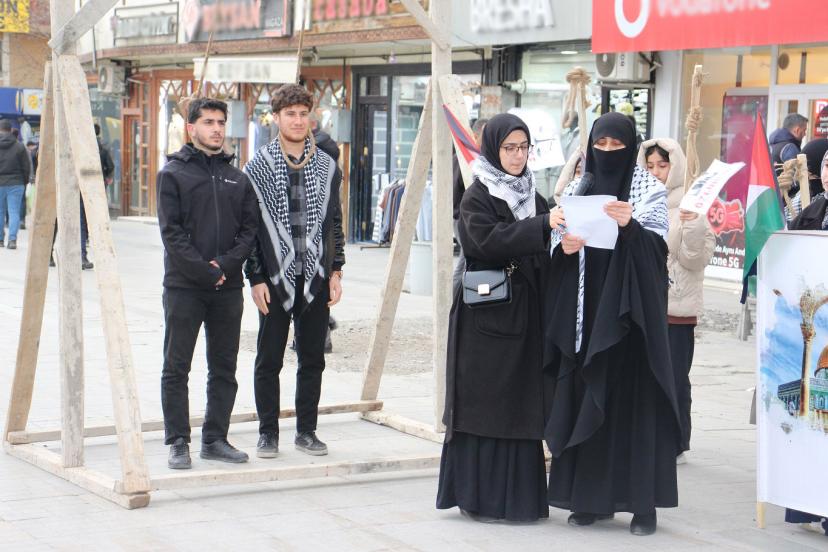 HÜDA PAR Ağrı Kadın Kolları Başkanlığı, işgal rejiminin Filistinli esirler hakkında aldığı idam kararına tepki göstermek amacıyla basın açıklaması düzenledi. Eylemde kurulan sembolik darağacı ile işgal rejiminin hukuksuz kararları protesto edildi.
