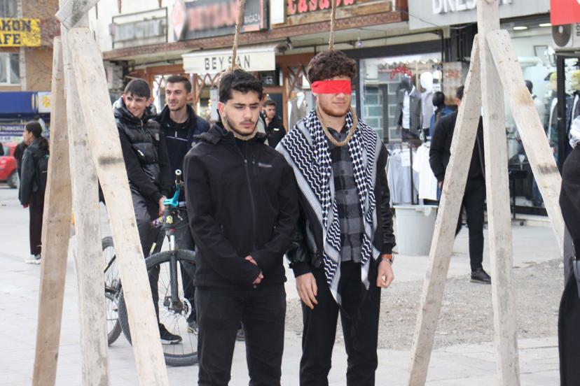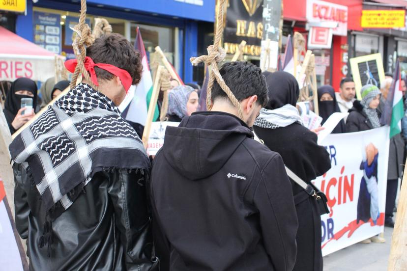 Katılımcıların ellerinde "Hukuk", "Adalet", "Özgürlük" ve "Filistin Halkını İdam Edecekler" yazılı dövizler taşıdığı eylemde, çarpıcı bir protesto gerçekleştirildi. Açıklamanın yapıldığı alanda kurulan temsili darağacında iki kişi Filistinli mahkumları canlandırarak boyunlarına ip geçirdi. Minyatür darağaçlarının da taşındığı etkinlikte, işgal rejiminin barbarlığı görsel bir protesto ile gözler önüne serildi.