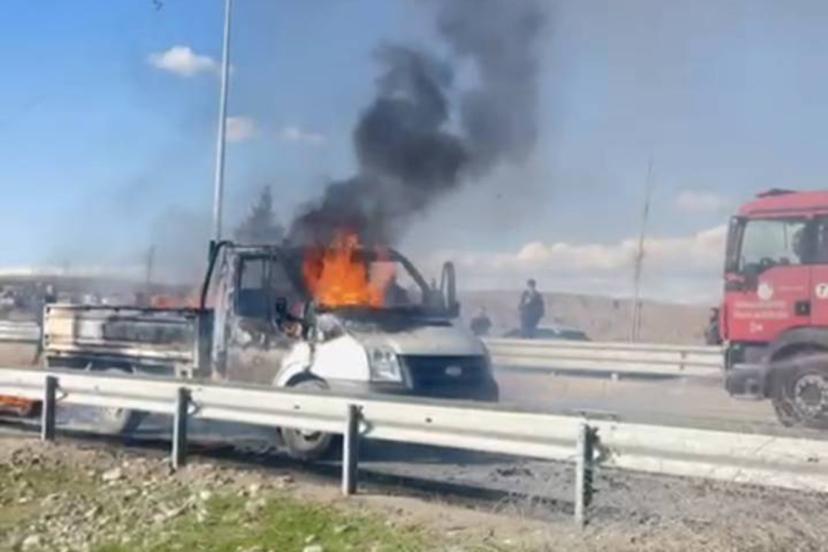 Plakası belirlenemeyen kasalı pikap, seyir halindeyken bilinmeyen bir sebeple yanmaya başladı.