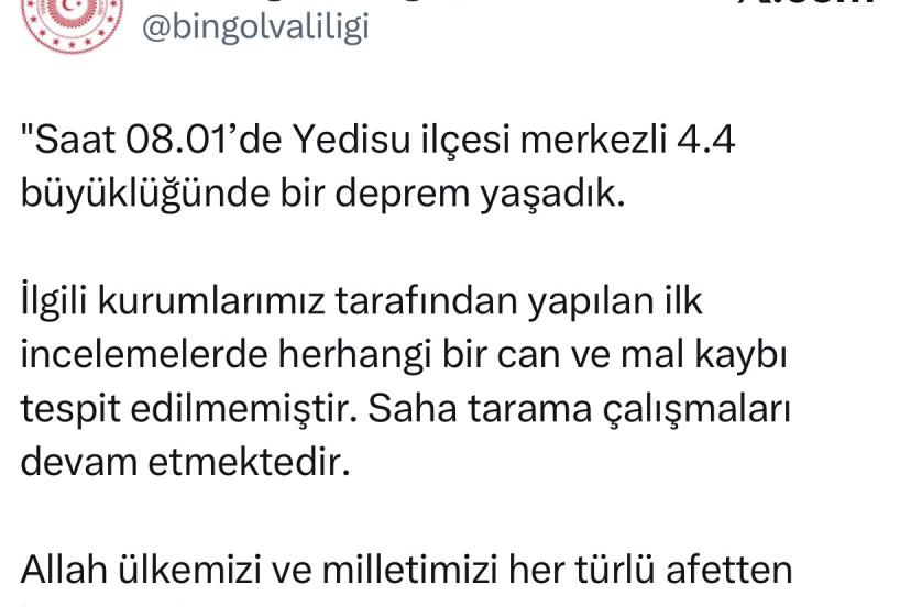 Depremin ardından Bingöl Valiliği’nden yapılan açıklamada, "Saat 08.01’de Yedisu ilçesi merkezli 4.4 büyüklüğünde bir deprem yaşadık. İlgili kurumlarımız tarafından yapılan ilk incelemelerde herhangi bir can ve mal kaybı tespit edilmemiştir. Saha tarama çalışmaları devam etmektedir. Allah ülkemizi ve milletimizi her türlü afetten korusun" denildi.