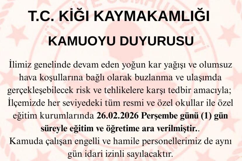 Bingöl’ün Karlıova ve Kiğı ilçelerinde etkili olan yoğun kar yağışı ve olumsuz hava şartları nedeniyle eğitime 1gün ara verildi. Kaymakamlıklardan yapılan açıklamada, "Devam eden yoğun kar yağışı, buzlanma ve ulaşımda yaşanabilecek tehlikelere karşı tedbir amacıyla ilçelerdeki tüm resmi ve özel örgün ile yaygın eğitim kurumları, kreş ve gündüz bakım evlerinde 26 Şubat 2026 Perşembe günü eğitim-öğretime 1 gün süreyle ara verildi" denildi.