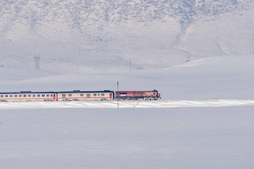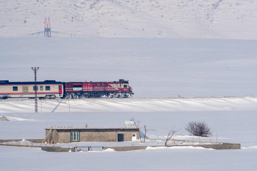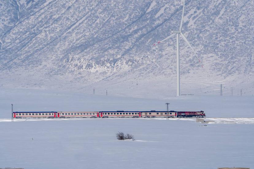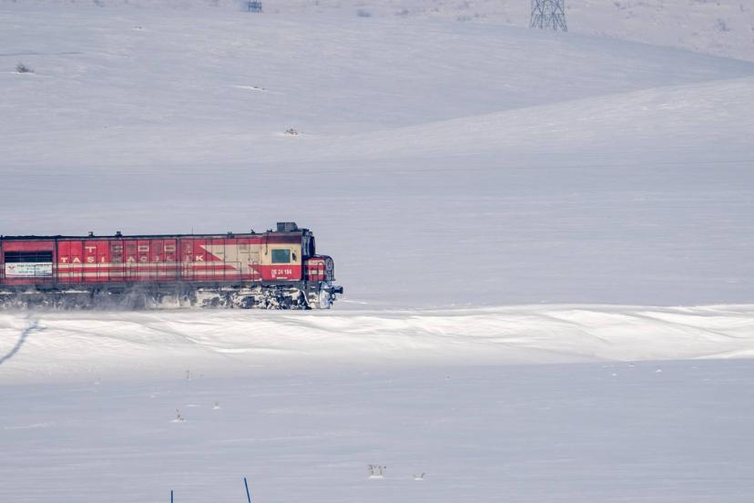 Karla kaplanan geniş ova üzerinde süzülen tren, beyaz örtüyle bütünleşen doğanın içinde adeta bir kartpostalı andıran görüntüler ortaya çıkardı.