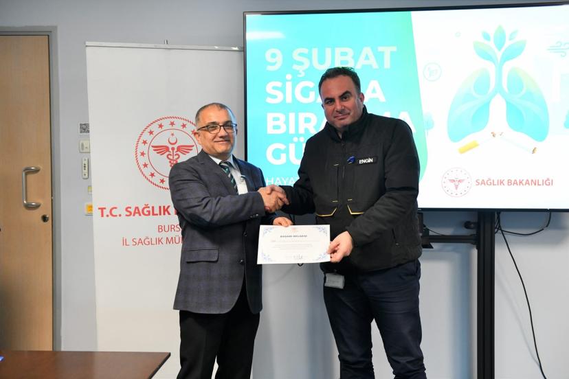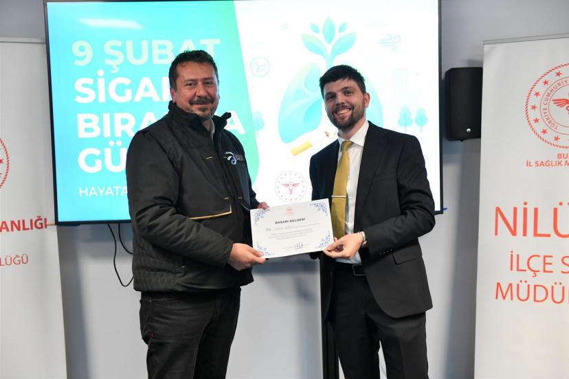 Sigarayı bırakarak iş arkadaşlarına örnek olan firma personeline sertifikaları; Dr. İrfan Oğuz, Uzm. Dr. İsmail Kaba ve Murat Tolga Görgülü tarafından teslim edildi. Yetkililer, bu tür "yerinde" sağlık hizmetlerinin iş verimliliğini artırmasının yanı sıra toplum sağlığı için de kritik bir öneme sahip olduğunu vurguladı.