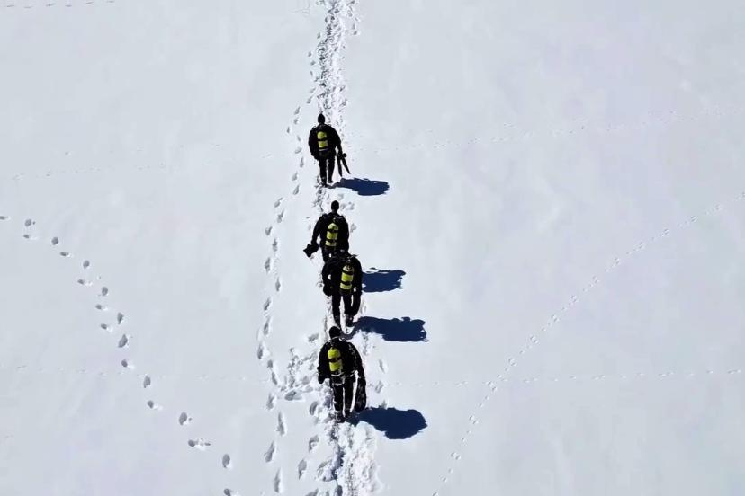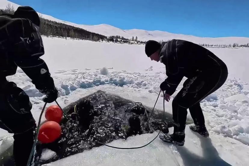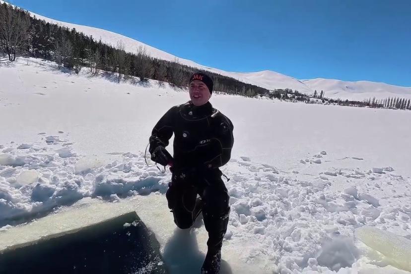 Jandarma Sualtı Arama Kurtarma (SAK) Timi, Palandöken’in zirvesinde, 2 bin 300 rakımda yüzeyi buz tutan Teke Deresi Göleti’ne dalış yaptı.