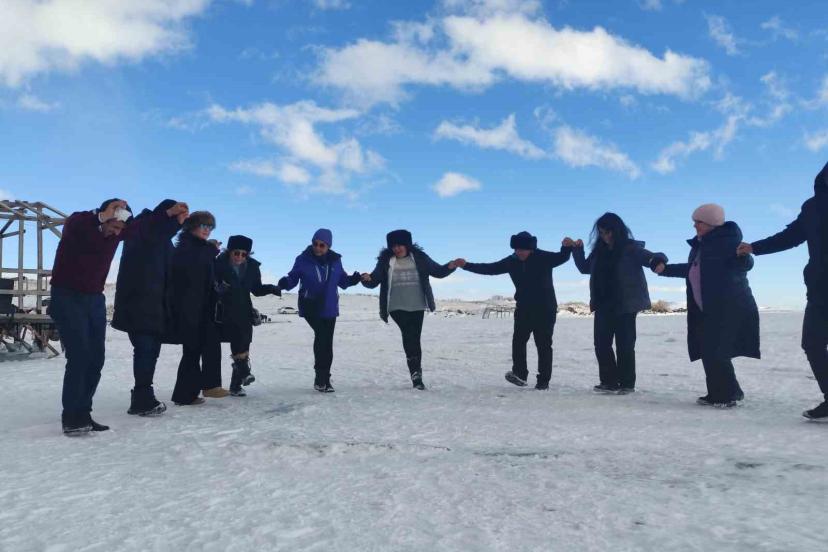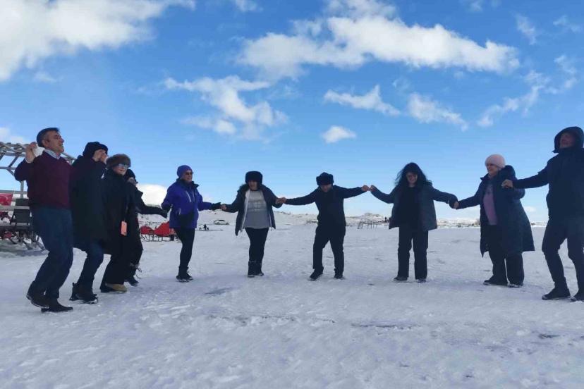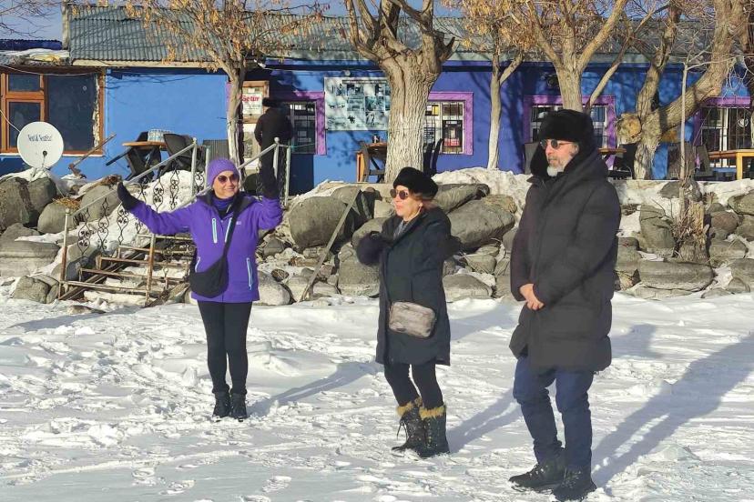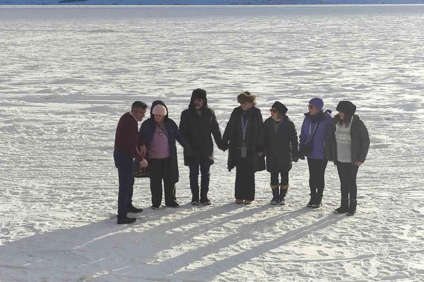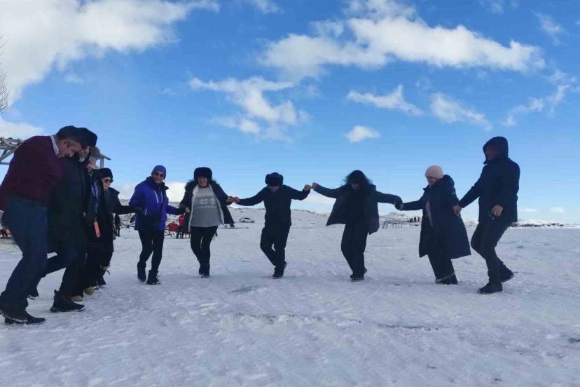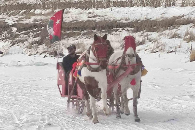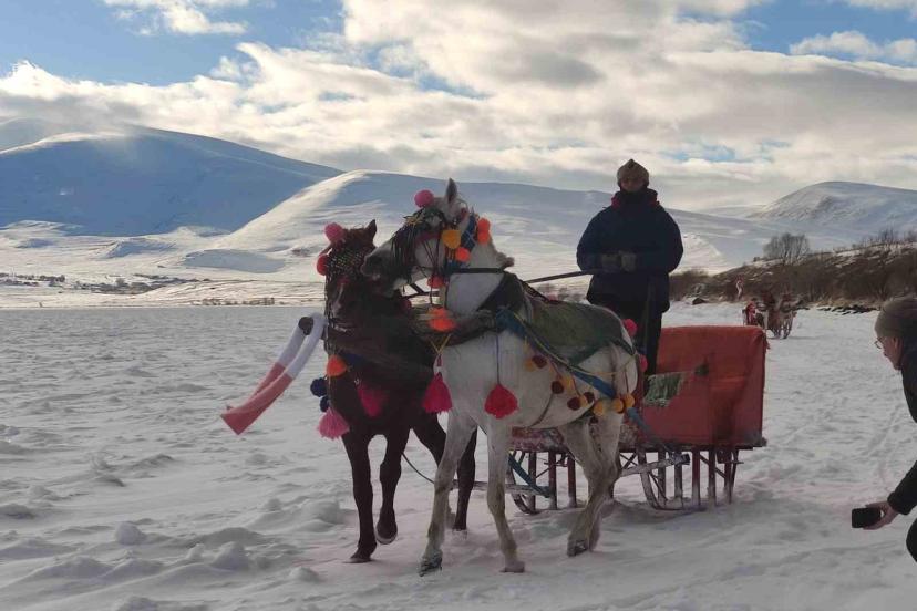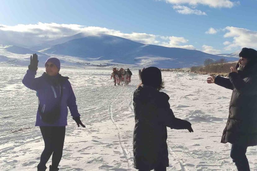 Yüzeyi tamamen donan Çıldır Gölü’ne gelen turistler, kar ve buz üzerinde halay çekti, atlı kızakla gezinti yaptı.