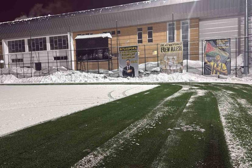 Yoğun kar yağışının ardından karla kaplanan stadyum zemini ve tribün çevresi, Bitlis Gençlik ve Spor İl Müdürlüğü ekipleri tarafından temizlenerek maçın oynanacağı alanda hazırlık yapılıyor.