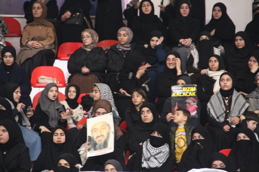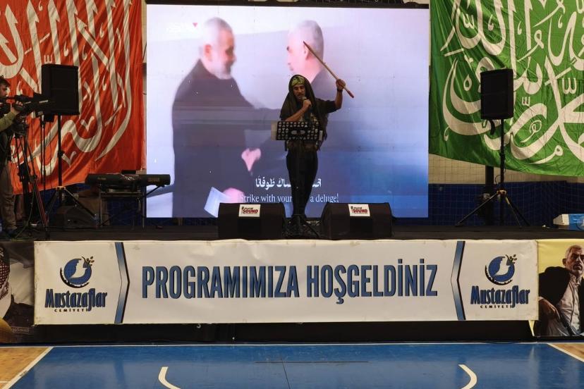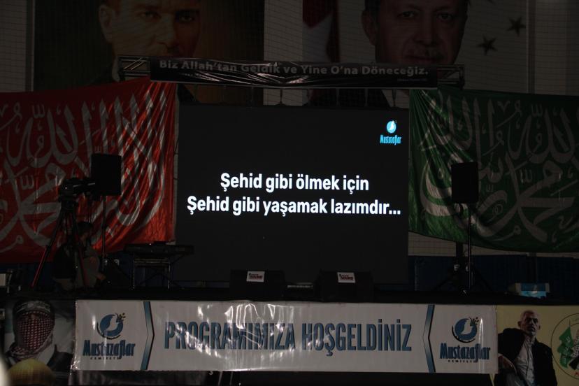 Program boyunca salonda sık sık tekbirler getirildi, yapılan konuşmalarda ve gösterilerde şehadet vurgusu öne çıktı.