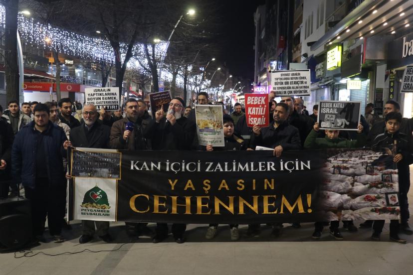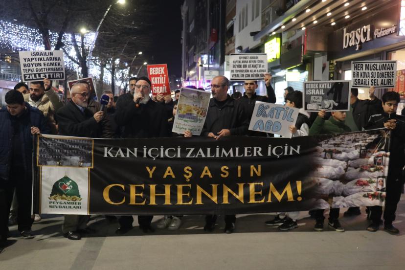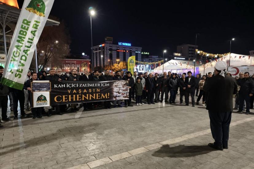 Peygamber Sevdalıları adına hazırlanan basın metnini okuyan Yunus Emre Tuncay, Katil Amerika'nın, soykırımcı siyonist barbarların, bir kez daha bir İslam beldesi olan İran'a vahşi bir şekilde saldırılarına tanıklık ediyoruz. Bu vahşi saldırılar ilk olmadığı gibi karşı çıkılmadıkça son saldırı da olmayacaktır. Müslümanların topraklarını işgal eden, kaynaklarını sömüren bu kan içici zalimler, her gün yeni bir İslam beldesine saldırı düzenlemekte, barbarca katliamlar gerçekleştirmektir. Dün Afganistan'da gerçekleştirdikleri katliamlarını, Irak'ta devam ettirdiler. Libya'da, Yemen'de taş üstünde taş bırakmadılar. Milyonlarca Müslümanı katlettiler, milyonlarca Müslümanı yurtlarından ederek mülteci durumuna düşürdüler. Suriye'yi, Lübnan'ı yeni icat ettikleri silahların deneme alanı haline getirerek on binlerce Müslümanı acımasızca kıyımdan geçirdiler. Yine on binlerce aileyi parçaladılar, yüzbinlerce insanı evsiz barksız bir şekilde mülteci kamplarına mahkûm ettiler. 3 yıldan fazladır, katil ABD ve vahşi siyonistler; Gazze'de yüzyılın en büyük soykırımını gerçekleştirdiler. Çocukları açlıktan, susuzluktan, ilaçsızlıktan ölüme mahkûm ettiler. Halen Gazzeli Müslümanlara yönelik en acımasız bir şekilde vahşi saldırılar devam ettirilmekte, dünyanın gözü önünde çocukların açlıktan ölmesi için ablukayı gaddarca sürdürmektedirler." şeklinde konuştu.