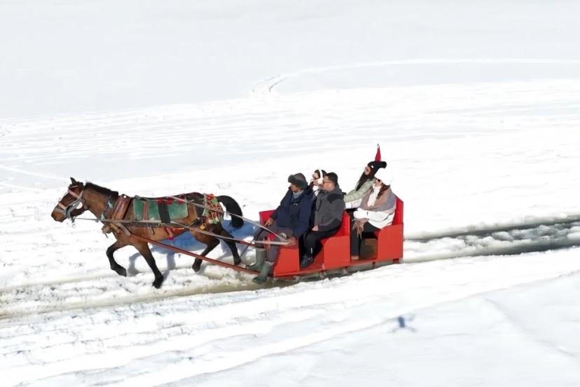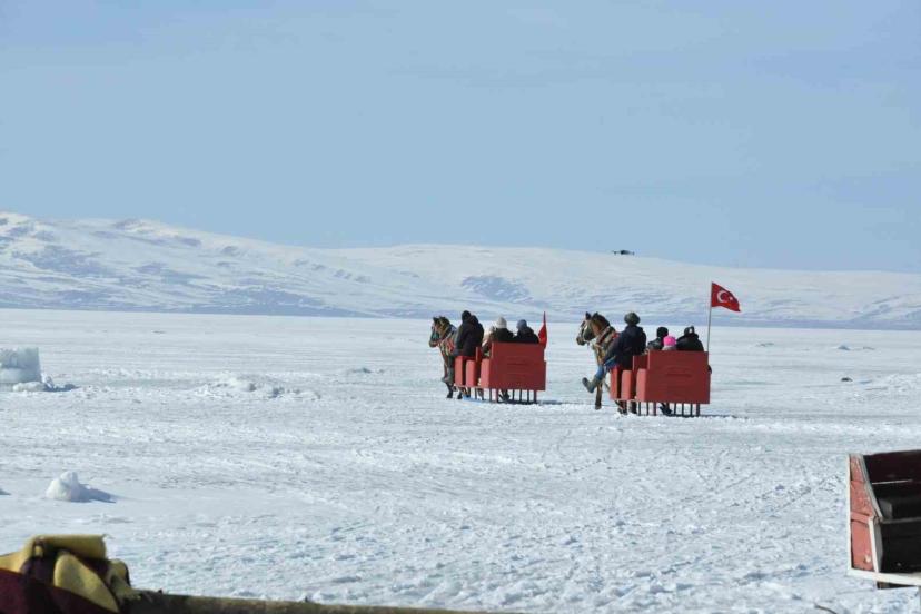 Buz kalınlığının güvenli seviye olan 70 santimetreye ulaşmasıyla birlikte, çivili nalları sayesinde buzda kaymadan ilerleyen atlar, arkalarındaki kızaklarla turistleri gölün derinliklerine doğru eşsiz bir yolculuğa çıkarıyor. Adrenalin sevenler için zaman zaman dörtnala koşturulan atlar, izleyenlere adeta görsel bir şölen sunuyor.