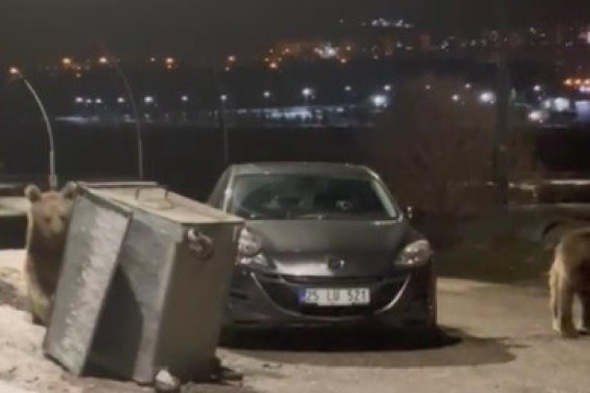 Kars’ın Sarıkamış ilçesinde yerleşim alanına inen bozayılar, çöpte yiyecek ararken görüntülendi.