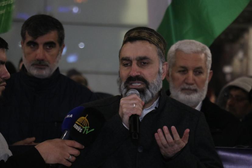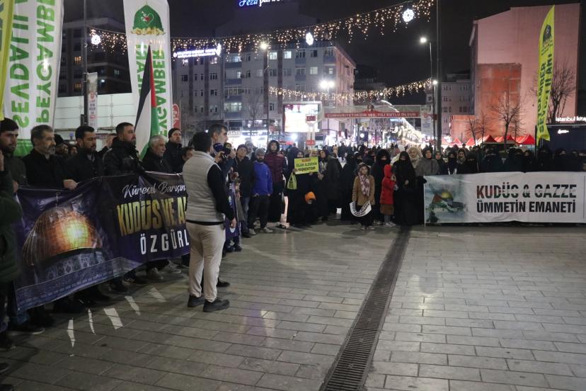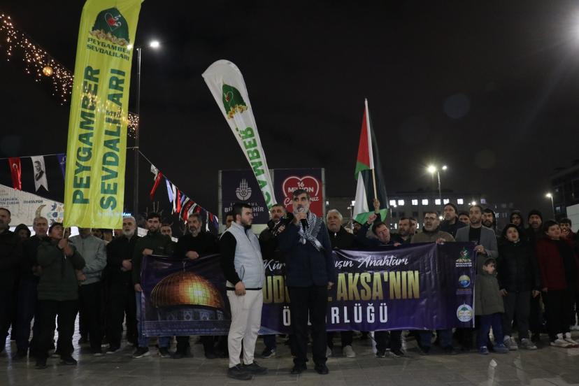 Bağcılar Meydanı'nda Ercan Bozkurt'un Kur'an-ı Kerim tilaveti ile başlayan programda konuşan HÜDA PAR İstanbul İl Başkanı Mehmet Eşin, Kudüs'ün yalnızca bir şehir değil Müslümanların ilk kıblesi, Hazreti Ömer'in emaneti, Selahaddin Eyyubi'nin ikinci kez fethettiği kutsal bir mekân olduğunu ifade etti.
