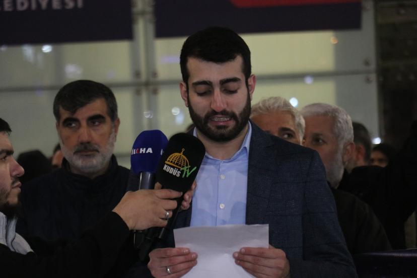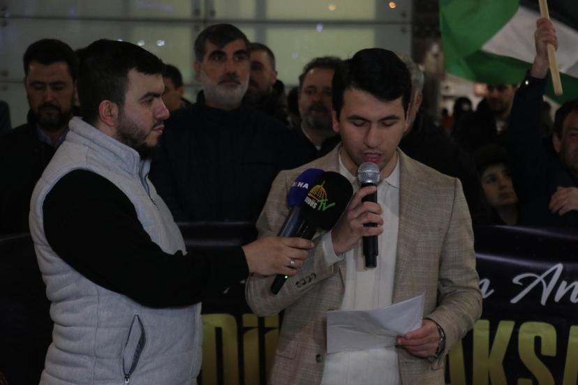 Peygamber Sevdalıları tarafından hazırlanan basın açıklamasını okuyan Yusuf İpek, "Kudüs, yalnızca Filistin halkının değil, bütün Müslümanların ve bütün insanlığın ortak mirasıdır. Mescid-i Aksa ise Müslümanların ilk kıblesi ve mukaddes mabetlerinden biridir. Ancak bugün Kudüs, Mescid-i Aksa ve Gazze; Siyonist işgal rejiminin sistematik saldırıları ve yayılmacı politikaları altında ağır bir kuşatma yaşamaktadır. İsrailin Gazze'de başlattığı ve bugün Lübnan'a, Suriye'ye, Yemen'e ve İran'a yaydığı çatışma süreci, asla bir güvenlik meselesi değildir. Bu, 'Arz-ı Mev'ud' hezeyanıyla bölge ülkelerini zayıflatma, parçalama ve köleleştirme operasyonudur. Siyonist akıl, kendi güvenliğini komşu ülkelerin yıkımında aramakta, attığı her adımda dünya barışının altına dinamit döşemektedir. Bu saldırganlık, 'israilin güvenliği' bahanesi altında bütün bölgeyi dizayn etmeyi hedefleyen emperyal bir projeye dönüşmüş ve dünya barışını doğrudan tehdit eden bir boyuta ulaşmıştır. Şurası açıktır ki mesele sadece Filistin meselesi değildir. Asıl mesele İslam coğrafyasının tüm direniş hatlarını kırmayı hedeflemektedir. Bugün Ortadoğu, modern dünyanın gözleri önünde sistematik bir yok etme operasyonuna sahne olmaktadır. Sadece sınırların değil, vicdanların da tarumar edildiği bu süreçte, Gazze ve Kudüs'e sahip olma adına Lübnan, Suriye, Yemen ve İran, küresel şer odaklarının hedef tahtasına oturtulmuştur." dedi.