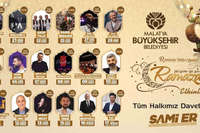 Ramazan ayı boyunca konserler, çocuk etkinlikleri, şiir ve dinleti programları, söyleşiler, Kahoot bilgi yarışmaları, tiyatro gösterimleri, çocuklar için Tekne Orucu İftar Programı, Kadir Gecesi Özel Programı ve Topkapı Sarayı’nda bulunan Mukaddes Emanetlerden oluşan sergi ile Ramazan’ın manevi iklimi Malatya’da yaşanacak. Ayrıca iftar öncesinde ve sonrasında gerçekleştirecek olan etkinlikler canlı yayınlarla sadece Malatya’da değil, dünyanın dört bir yanında izlenebilecek.