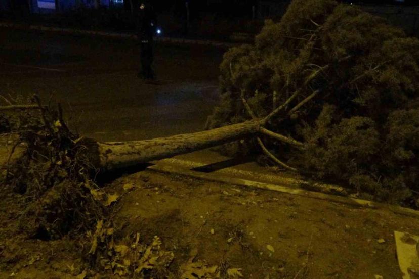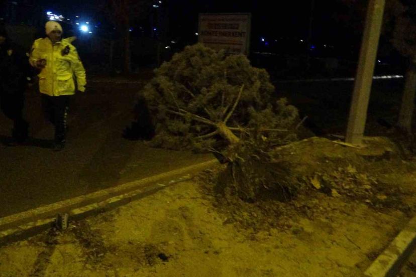 Malatya’da etkili olan fırtına, sağanak yağışla birlikte ağaçları kökünden söktü.