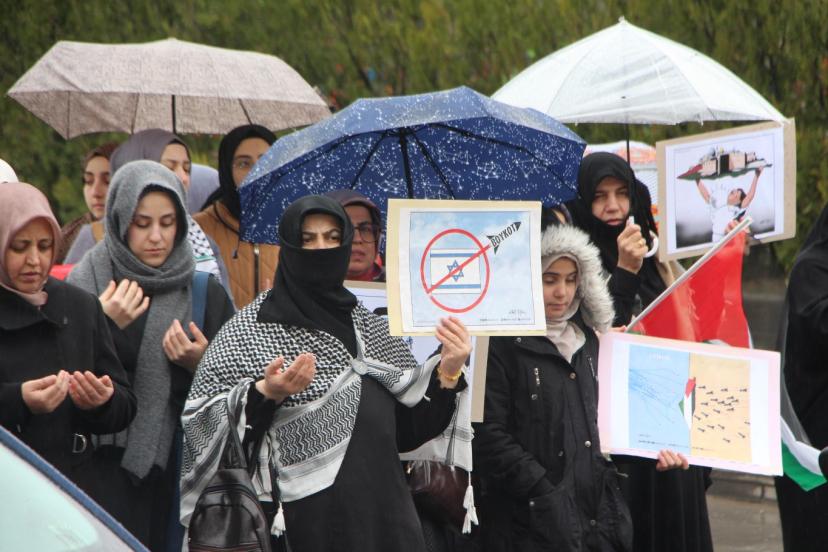 Meydanda toplanan Kudüs sevdalısı vatandaşlar, israil karşıtı sloganlar atarak Filistin ve Mescid-i Aksa’ya destek içerikli döviz ve pankartlar taşıdı. Yağmur altında yapılan basın açıklaması sırasında işgal rejimi israil ve ABD aleyhine sloganlar atıldı.