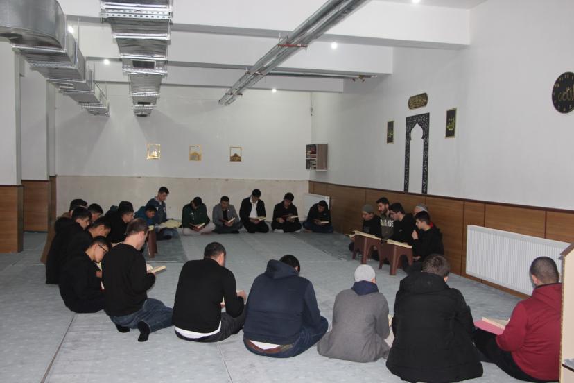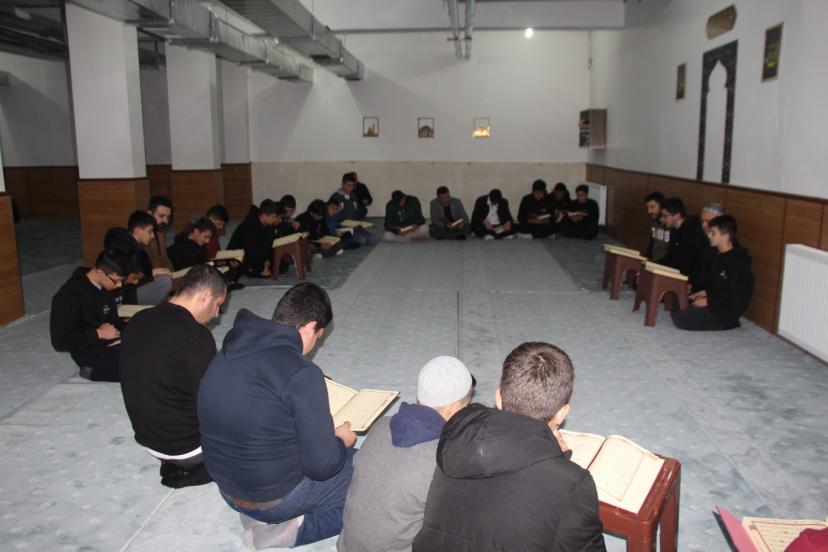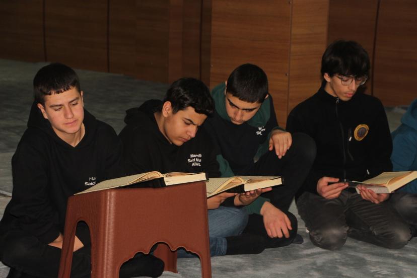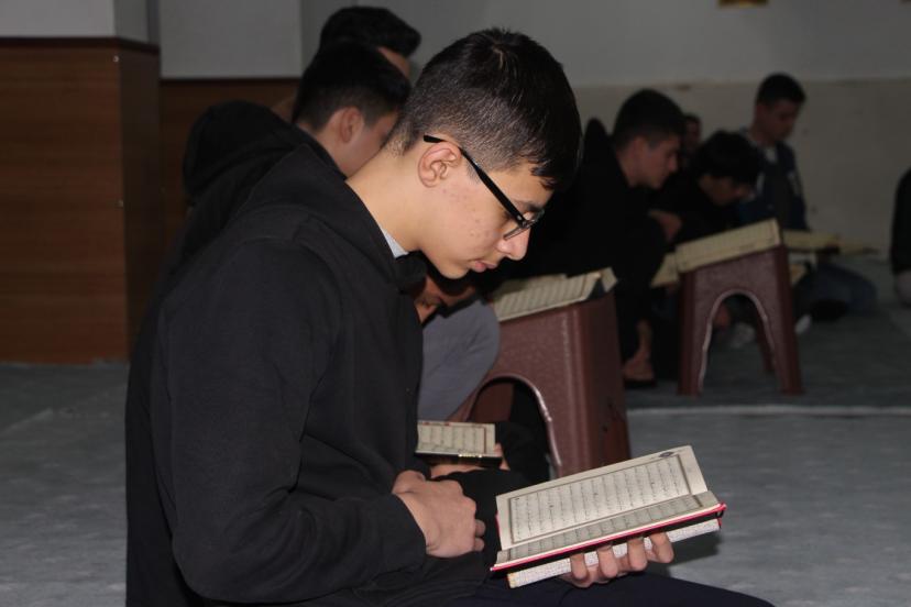 Artuklu Said Nursi İmam Hatip Lisesi'nde öğrenciler, mescitte öğle namazının ardından yoğun bir katılımla mukabele geleneğini devam ettiriyor.