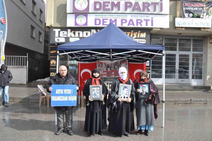 Muş’ta çocuklarının terör örgütü PKK tarafından dağa götürüldüğünü öne süren ailelerin DEM Parti İl Başkanlığı binası önünde başlattığı evlat nöbeti devam ediyor. Haftalardır kararlılıkla sürdürülen eylemde aileler, her çarşamba günü olduğu gibi bu hafta da soğuk havaya rağmen bir araya geldi. Ellerinde çocuklarının fotoğraflarını taşıyan anne ve babalar, "Artık Yeter", "Yakamızdan Düşün" ve "Anneler Direniyor" yazılı pankartlarla seslerini duyurmaya çalıştı. Zaman zaman duygusal anların yaşandığı eylemde aileler, çocuklarına güvenlik güçlerine teslim olmaları yönünde çağrıda bulundu.