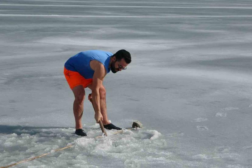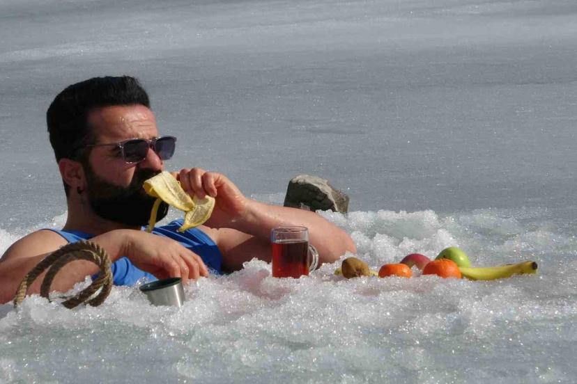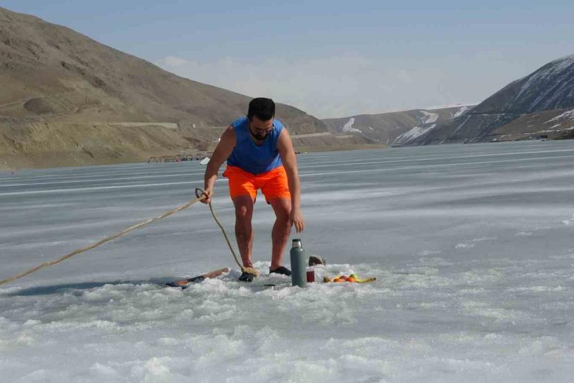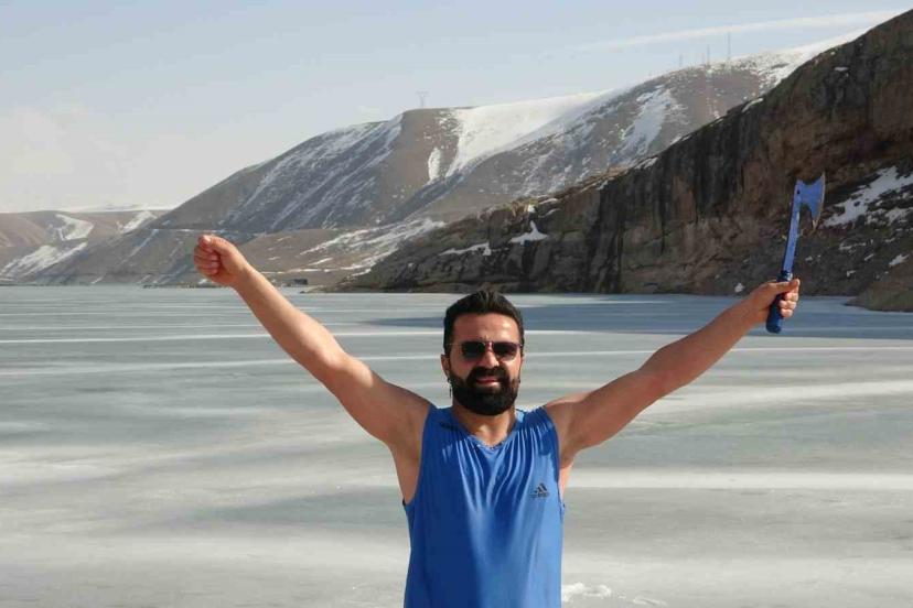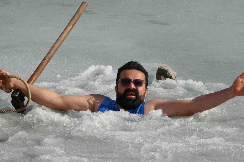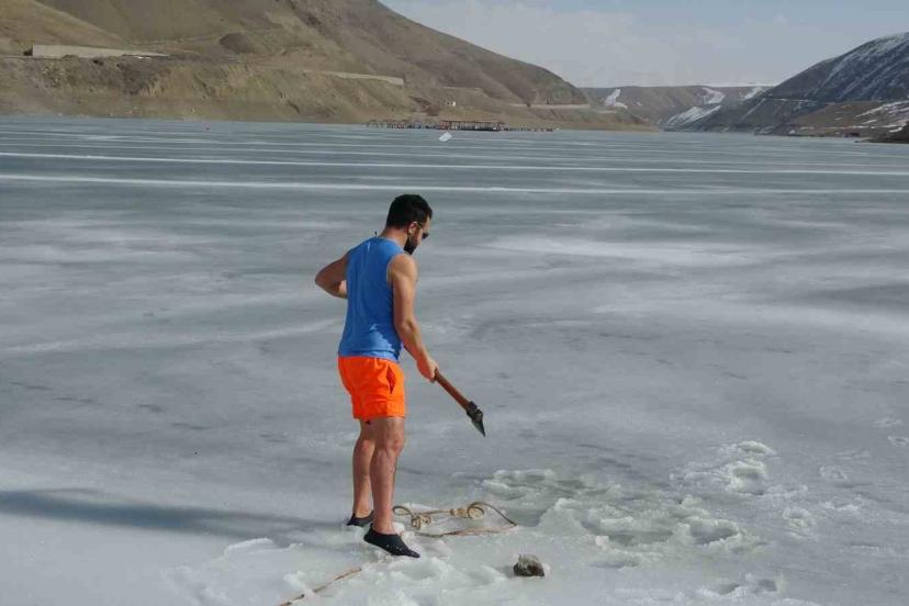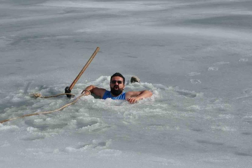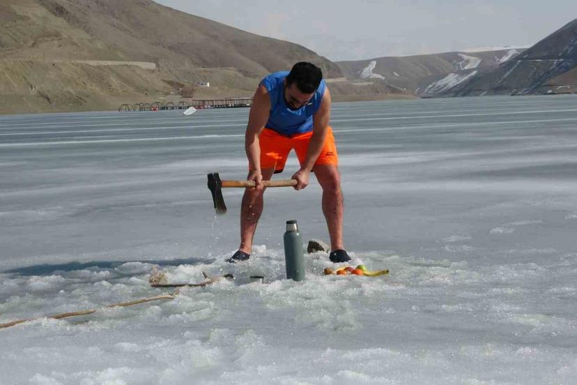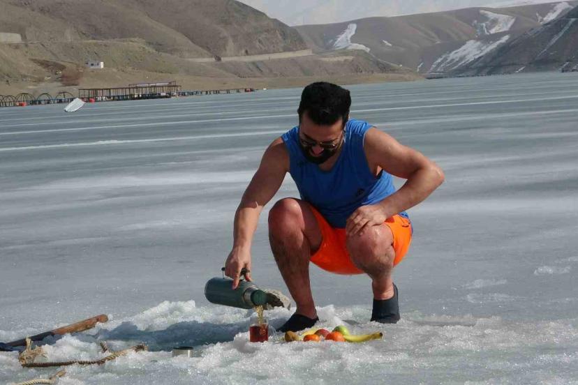 Van’da sıra dışı etkinlikleriyle tanınan maceracı bir öğretmen, barajdaki suyun buz tutmuş yüzeyini kırarak suya girdi. Balık avlamak yerine buzlu suyun içinde çay içen öğretmen, hem sağlıklı yaşama hem de kentin kış turizmine dikkat çekti.