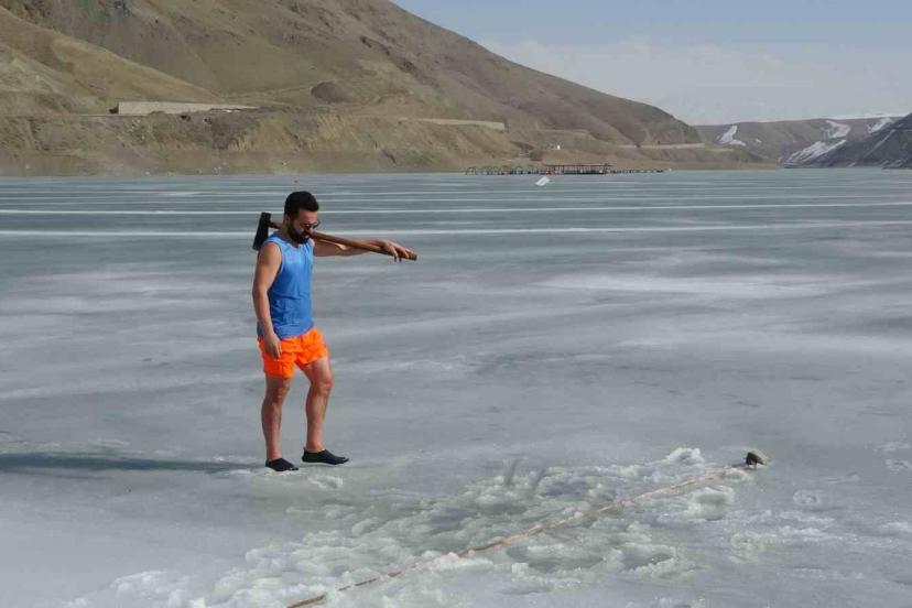 Van’da sıra dışı etkinlikleriyle tanınan maceracı bir öğretmen, barajdaki suyun buz tutmuş yüzeyini kırarak suya girdi.