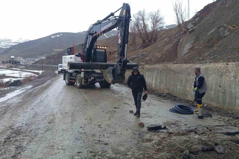 Hakkari’de yağışların ardından meydana gelen toprak kayması nedeniyle zarar gören içme suyu isale hattı, ekiplerin yoğun çalı...
