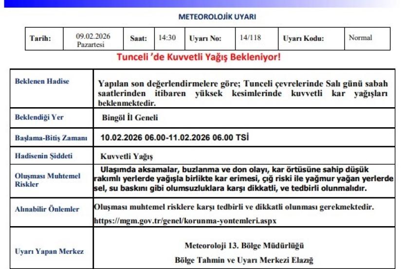 Meteoroloji 13’üncü Bölge Müdürlüğü tarafından yapılan uyarıda, "Yapılan son değerlendirmelere göre; Tunceli çevrelerinde Salı günü sabah saatlerinden itibaren yüksek kesimlerinde kuvvetli kar yağışları beklenmektedir. Ulaşımda aksamalar, buzlanma ve don olayı, kar örtüsüne sahip düşük rakımlı yerlerde yağışla birlikte kar erimesi, çığ riski ile yağmur yağan yerlerde sel, su baskını gibi olumsuzluklara karşı dikkatli, ve tedbirli olunmalıdır" denildi.