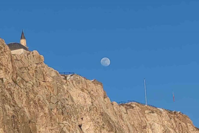 Van’da dolunay öncesi gökyüzünde beliren şişkin ay, tarihi Van Kalesi ile birlikte kartpostallık görüntüler oluşturdu. Akşam saatlerinde etkisini gösteren berrak hava, ayın tüm ihtişamıyla izlenmesine imkanı sağladı.