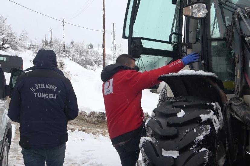Zorlu kış şartlarına rağmen Pülümür’de hem hasta yatağı hem de Ramazan kolisi dağıtımı yapan Kızılay ekibi, yoğun kar yağışı nedeniyle yolda kaldı. İl Özel İdaresi ve belediye ekiplerinin desteğiyle yol açıldı, hasta yatağı kepçe yardımıyla ihtiyaç sahibine ulaştırıldı.