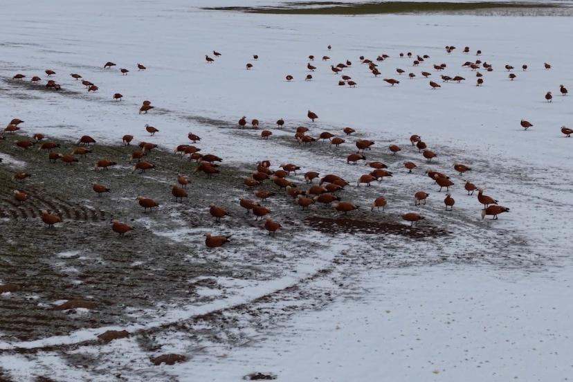 Görüntü yönetmeni Mustafa Başgöze tarafından drone ile kaydedilen görüntülerde, ördek türü olan angut kuşlarının Erzincan Ovası’nda karlı arazide sürü halinde dolaştığı görüldü.