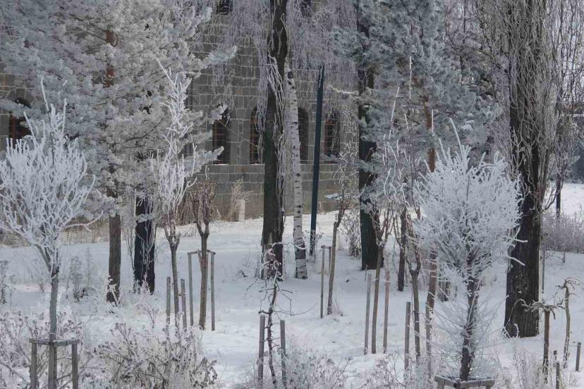 Ardahan’da soğuk hava yüzünden ağaçlar kırağı tutarken, çatılarda buz sarkıtları oluştu.
