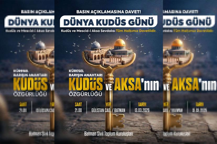 Batman Sivil Toplum Kuruluşları tarafından yapılan çağrıda, "Kudüs ve Mescid-i Aksa sevdalısı tüm halkımız davetlidir." ifadelerine yer verildi. Açıklamada ayrıca "Küresel barışın anahtarı Kudüs ve Aksa'nın özgürlüğüdür." mesajı paylaşıldı.
