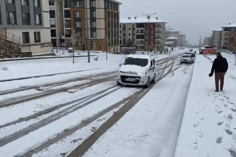 Elazığ’da sabahın ilk saatlerinde etkili olan kar yağışından dolayı, araçlar rampa yollarda mahsur kaldı. Patinaj çeken araçlar kameraya yansıdı.