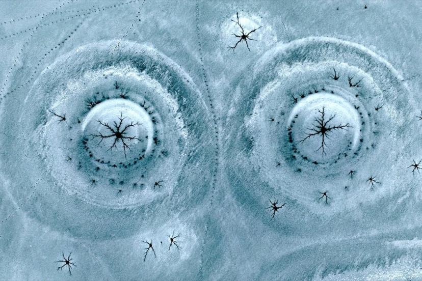Drone'la kaydedilen görüntülerde, göl yüzeyinde halka formunda buz yapıları ve bu halkaların merkezinden çevreye doğru yayılan çatlaklar net şekilde görüldü. Beyaz ve açık mavi tonların hâkim olduğu buz tabakası, havadan bakıldığında insan gözünün iris ve göz bebeğini çağrıştıran desenler oluşturdu.