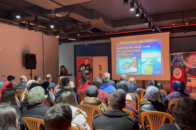 Ortaokul, lise ve üniversite öğrencilerinin yanı sıra yetişkin katılımcıların da yer aldığı buluşmada, Türkiye’nin ilk deneysel test pilotu Özpala “Köklerden Göklere” temalı bir sunum gerçekleştirildi.