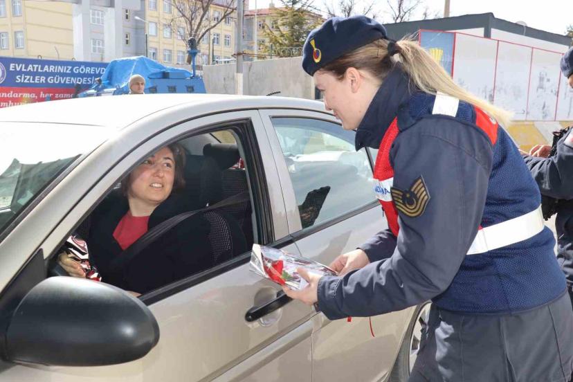 Elazığ’da İl Jandarma Komutanlığı ekipleri tarafından 8 Mart Dünya Kadınlar günü dolayısıyla, trafikte araç kullanan kadın sürücü ve yolculara karanfil hediye edildi.