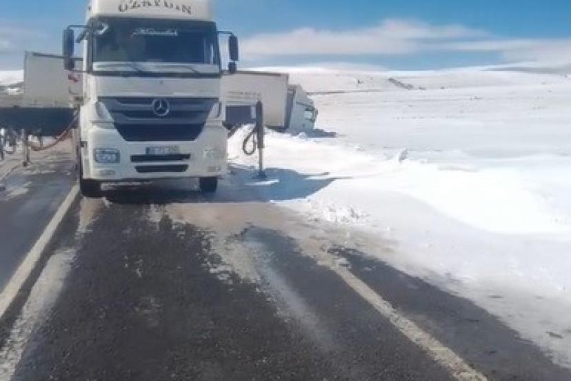 Kars’ta sürücüsünün direksiyon hakimiyetini kaybettiği tır, kayarak yolu kapattı.