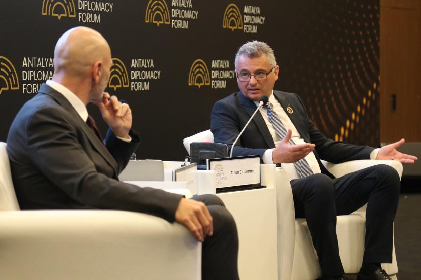 KKTC Cumhurbaşkanı Tufan Erhürman, Antalya Diplomasi Forumu'nda (ADF) panel düzenledi. Erhürman, konuşması sırasında salondaki ses sisteminde teknik sorun yaşanması nedeniyle konuşmasının bir bölümünü de ayakta mikrofonsuz sürdürdü. Konuşmasının başında kendini tanıtan ve Türkiye Cumhuriyeti ile yakın ilişkiler içinde bulunduğunu ve siyasetin içinden gelen biri olduğunu belirten Erhürman, yaptığı tüm açıklamalarda, 'Bugüne kadar Kıbrıs'ta bütün cumhurbaşkanları, bütün liderler Kıbrıs sorununu ve Kuzey Kıbrıs'ın dış politikasını elbette Türkiye Cumhuriyeti'yle yakın istişare ve koordinasyon içerisinde yürüttüler. Ben de bunu bu şekilde yürütecek olan liderlerden biriyim' dediğini söyledi. 6 aylık sürede de bunun böyle olduğunu belirten Erhürman, “Daha da yakından birbirimizi tanıyacağımızdan eminim, şüphe olarak dile getirilen şeylerin hiçbirinin realite ile bağdaşmadığını bir genelleme olarak söyleyeyim" dedi.