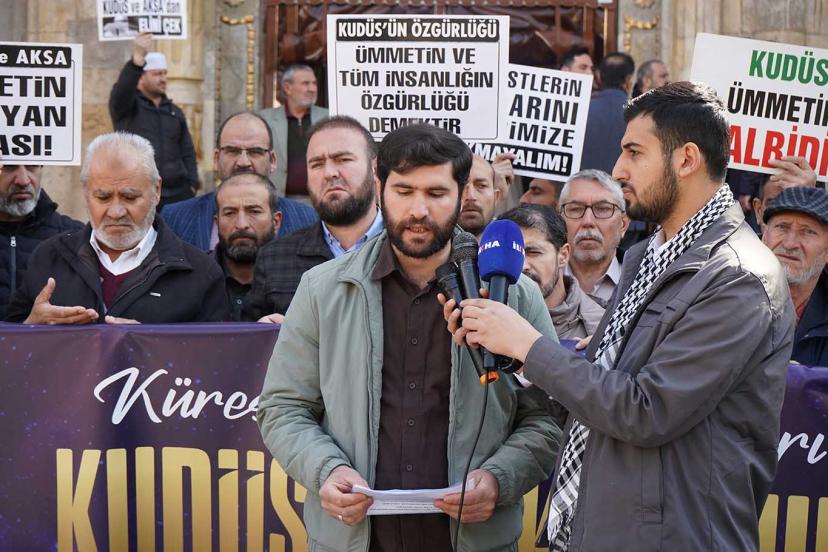 Konya'da Aziziye Camisi önünde Cuma namazı çıkışında gerçekleştirilen programda Peygamber Sevdalıları, Kudüs, Mescid-i Aksa ve Filistin’in özgürlüğü için çağrı yaptı.