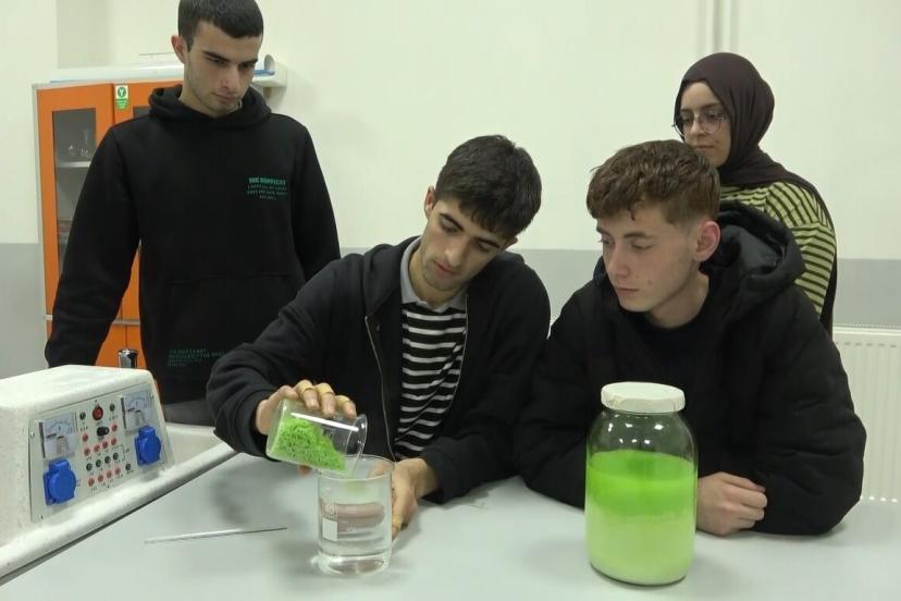 Kimya öğretmeni Hatun Çaldak, yaklaşık 5 yıldır öğrencileriyle birlikte geri dönüşüm temelli projeler yürüttüklerini belirterek, "Şu an okulumuzun laboratuvarında sıvı sabunumuzu yapmaktayız. Bunu geçen sene atık yağlardan elde ettiğimiz katı sabunları belirli işlemler sonucunda sıvı sabun haline getiriyoruz. Bunu okulumuzun lavabolarında kullanmak üzere yaptık. Amacımız atık yağları çöpe atmamak, geri dönüştürmek ve katı sabunlarım kullanım süresi uzun olmadığı için sıvı sabun elde ederek daha uzun süreli kullanım sağlamak. Okulumuza 5 yıldır bu şekilde katkıda bulunuyoruz. Öğrencilerimiz bu konuda oldukça istekli ve özverili çalışıyor" dedi.