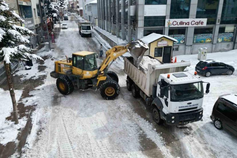 Kars’ın Sarıkamış ilçesinde Belediye Başkanlığı’na bağlı Temizlik İşleri Müdürlüğü’nce karla mücadele çalışmaları aralıksız devam ediyor. İlçe merkezinde hayatı olumsuz etkileyen kar kütleleri, belediye ekiplerince yürütülen hummalı çalışma ile şehir dışına naklediliyor.