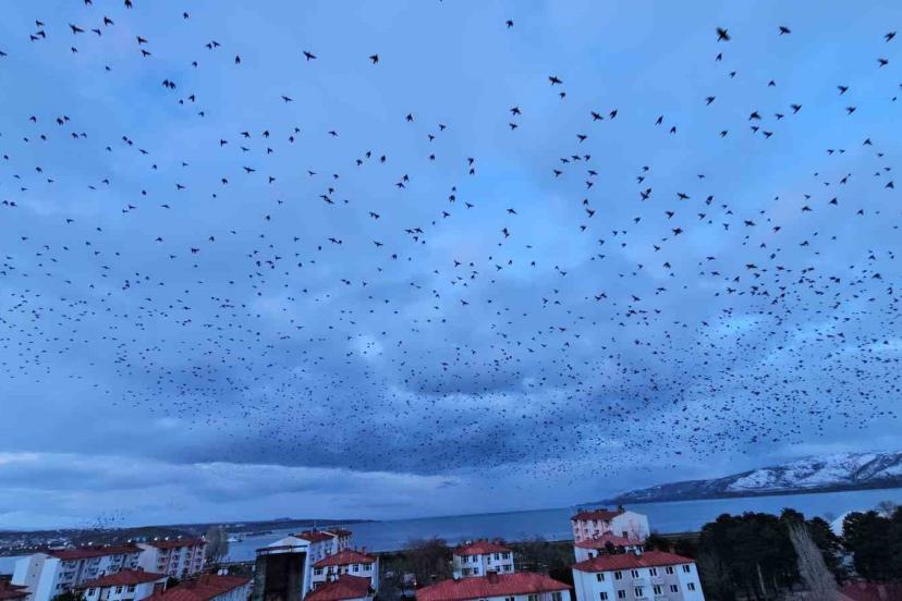 Bitlis’in Tatvan ilçesinde akşam saatlerine doğru gökyüzünde beliren binlerce sığırcık, izleyenlere görsel şölen sundu.