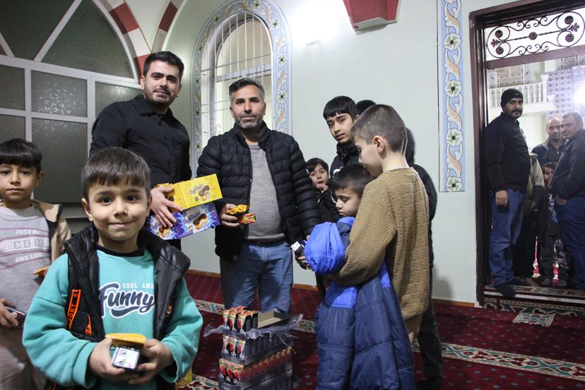 Teravih namazına camiye gelen çocuklara çeşitli ikramlar sunuluyor