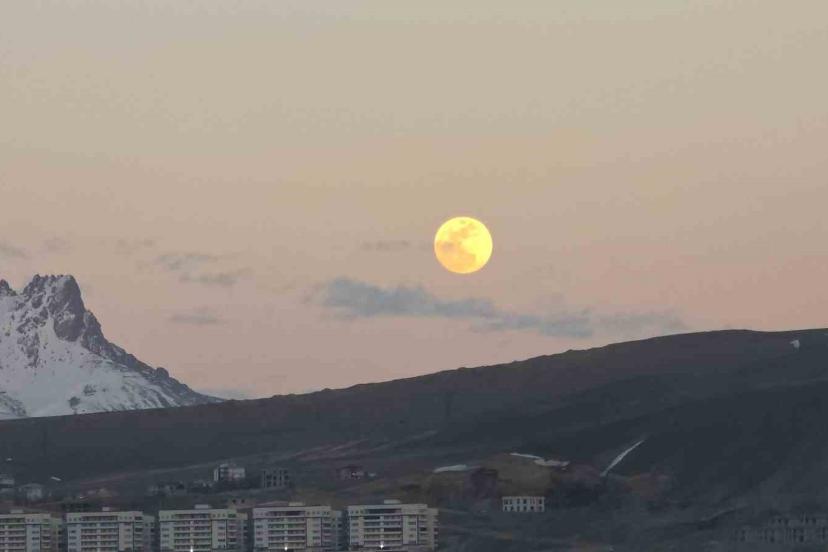Van’da baharın habercisi olarak bilinen ’pembe dolunay’, akşam saatlerinde Erek Dağı’nın zirvesinden yükselerek muhteşem manzarasıyla izleyenlere görsel şölen sundu. Kent genelinde açık ve sakin havanın etkili olmasıyla birlikte gökyüzünde beliren dolunay, kısa sürede vatandaşların ilgisini çekti.