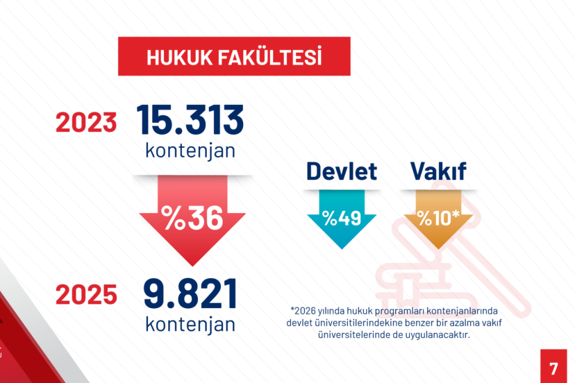 Özvar, hukuk fakültesi kontenjanlarında son yıllarda önemli düzenlemelerin gerçekleştiğini söyleyerek, 2023-2025 yılları arasında devlet ve vakıf üniversitelerinde kontenjanların 15 bin 313’den 9 bin 821’e düştüğünü kaydetti. Bunun oransal olarak yüzde 36’ya tekabül ettiğini belirten Özvar “Devlet üniversitelerinde Hukuk Fakültesi kontenjanlarındaki 4 bin 955 azalma ile yüzde 49; vakıf üniversitelerinde ise 537 ile yüzde 10 olarak gerçekleşmiştir. Hukuk programları kontenjanlarında benzer bir azalma 2026 yılında vakıf üniversitelerinde de uygulanacaktır.” dedi.