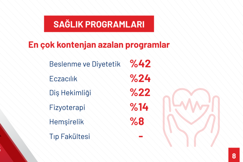 “Beslenme ve Diyetetik Programı en fazla kontenjanı düşürülen program olmuştur. Bu programın toplam kontenjanı 6 bin 922’den 4 bin 24’e inmiştir. Bunun oransal karşılığı yüzde 42’dir. Eczacılık programlarında kontenjan 4 bin 512’den 3 bin 416’ya düşmüş, oransal olarak yüzde 24’lük bir azalma gerçekleşmiştir. Diş Hekimliği programlarında kontenjan 9 bin 127’den 7 bin 81’e düşmüştür ve bu yüzde 22 oranında bir düşüşü göstermektedir. Fizyoterapi ve rehabilitasyon programlarının kontenjanı 6 bin 761’den 5 bin 826’ya, yaklaşık yüzde 14’lük azalmaya, hemşirelik programlarının kontenjanı ise 18 bin 465’ten 17 bin 36’ya yaklaşık yüzde 8 azalmaya gidilmiştir. Tıp Fakültesi kontenjanları ise bu dönemde korunmuştur. Sağlık programlarındaki kontenjan düşüşü son yıllarda büyük oranda devlet üniversitelerinde gerçekleşmiştir. 2026 yılında vakıf üniversitelerinde de bu programlar için kontenjanlar yeniden değerlendirilecek ve kontenjanlarda indirime gidilecektir.”