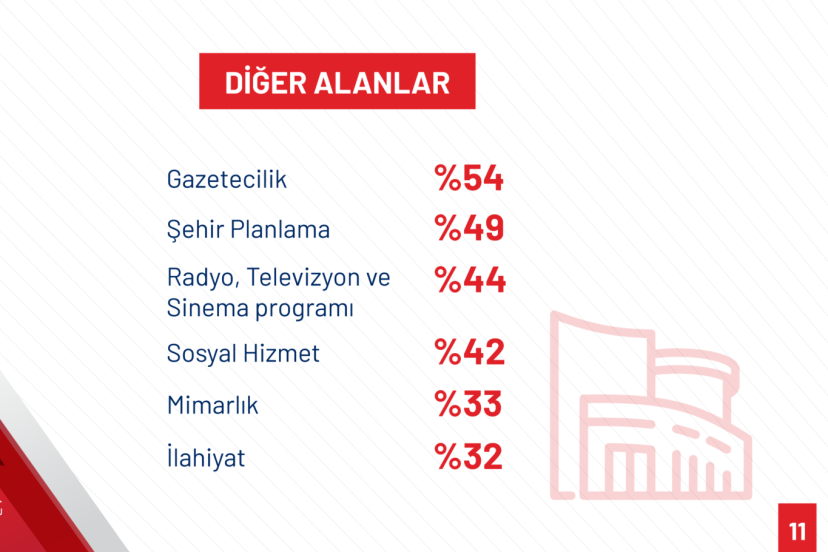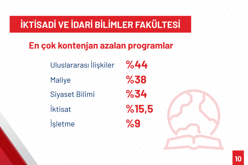 “Gazetecilik programı kontenjanları 4 bin 677’den 1866’ya düşmüş, oransal olarak yüzde 54 azalmıştır. Şehir ve Bölge Planlama programı kontenjanları 2 bin 448’den 1240’a düşmüş, oransal olarak yüzde 49 azalmıştır. Radyo, Televizyon ve Sinema programı kontenjanları 5 bin 180’den 2 bin 870’e düşmüş, oransal olarak yüzde 44 azalmıştır. Sosyal Hizmet programı kontenjanları 4 bin 677’den 2 bin 691’e düşmüş, oransal olarak yüzde 42 azalmıştır. Mimarlık programı kontenjanları 6 bin 365’ten 4 bin 264’e düşmüş, oransal olarak yüzde 33 azalmıştır. İç Mimarlık programı kontenjanları 2 bin 386’dan 1594’e düşmüş, oransal olarak yüzde 33 azalmıştır. Psikoloji programı kontenjanları 11 bin 966’dan 10 bin 428’e düşmüş, oransal olarak yüzde 13 azalmıştır.”