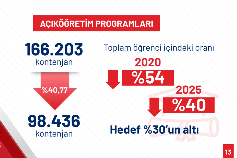 Son yıllar yapılan düzenlemelerle açıköğretim kontenjanlarının da 166 bin 203’ten 98 bin 436’ya yüzde 40,77 düşürüldüğünü kaydeden Özvar “2020 yılında toplam yükseköğretim öğrencileri içinde açık öğretimin oranı yüzde 54 iken; 2025 yılı itibariyle bu oran yüzde 40’a gerilemiştir. Bu oranın 5 yıl içerisinde yüzde 30’un altına düşürülmesi hedeflenmektedir. Açıköğretimi, yükseköğretim çağındaki gençlerden ziyade yetişkin eğitimi ve hayat boyu öğrenme amacına hizmet edecek şekilde yapılandırıyoruz.” değerlendirmesinde bulundu.