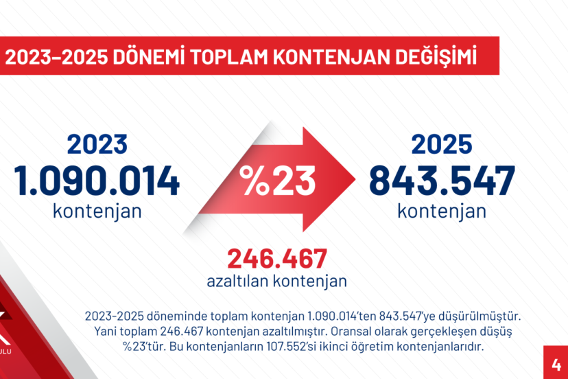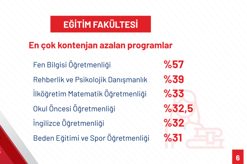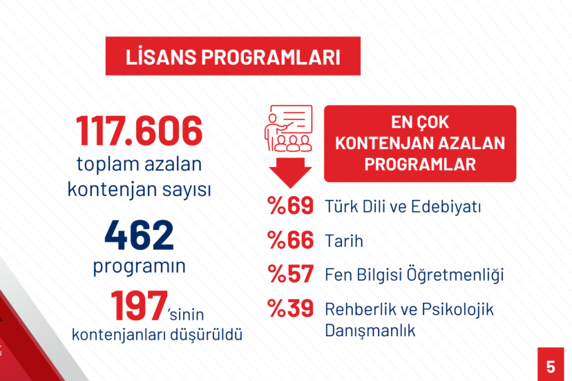 “2023-2025 döneminde toplam kontenjan 1 milyon 90 bin 14’ten 843 bin 547’ye düşürülmüştür. Toplam 246 bin 467 kontenjan azaltılmıştır. Oransal olarak gerçekleşen düşüş yüzde 23’tür. Bu kontenjanların 107 bin 552’si ikinci öğretim kontenjanlarıdır. 2023-2025 döneminde, toplam 462 lisans programından 197’sinin kontenjanları düşürülmüştür. Bu lisans programlarında kontenjan sayısı toplamda 117 bin 606 azalmıştır. En fazla kontenjan düşüşü gerçekleşen lisans programlarının başında öğretmenliğe kaynak teşkil eden programlar yer almaktadır. Türk Dili ve Edebiyatı kontenjanları 12 bin 15’ten 3 bin 680’e yüzde 69, tarih kontenjanları 10 bin 658’den 3 bin 646’ya yüzde 66 düşürülmüştür. Fen Bilgisi Öğretmenliği kontenjanı 2 bin 864’ten 1219’a yüzde 57 düşürülmüş ve kontenjanı en fazla azalan program olmuştur.”