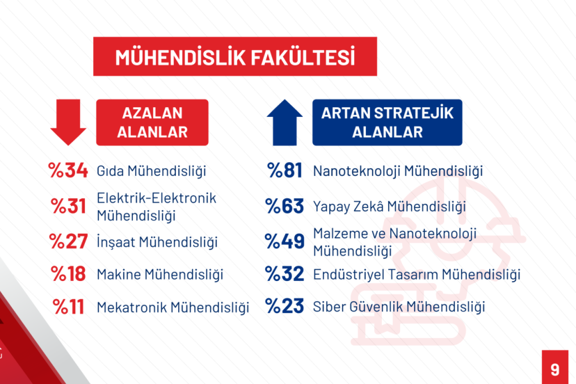 “Yapay Zeka Mühendisliği yüzde 63; Siber Güvenlik Mühendisliği gibi mühendislik programları ile Harita Mühendisliği yüzde 23; Gemi ve Deniz Teknolojisi Mühendisliği yüzde 19; Jeoloji Mühendisliği yüzde 8; Nanoteknoloji Mühendisliği yüzde 81; Gemi Makineleri İşletme Mühendisliği yüzde 4; Otomotiv Mühendisliği yüzde 4; Uçak Mühendisliği yüzde 3; Deniz Ulaştırma İşletme Mühendisliği yüzde 9; Endüstriyel Tasarım Mühendisliği yüzde 32; Malzeme ve Nanoteknoloji Mühendisliği yüzde 49; Orman Endüstrisi Mühendisliği yüzde 16; Gemi İnşaatı ve Gemi Makineleri Mühendisliği yüzde 8; Metalurji ve Malzeme Mühendisliği yüzde 3; Su Ürünleri Mühendisliği yüzde 7.”